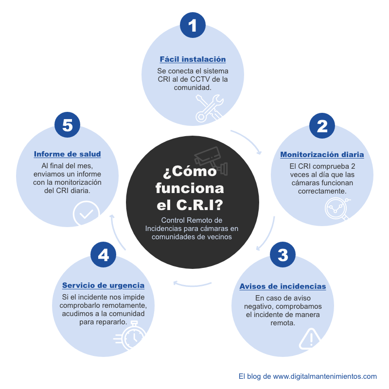 El CRI es un innovador y eficaz servicio de videovigilancia para las Comunidades de vecinos, basado en un sistema de seguridad remoto que complementa a las cámaras de seguridad. De forma totalmente remota, se controlan todos las cámaras de la comunidad de vecinos y se detectan averías en las cámaras de seguridad a tiempo real.